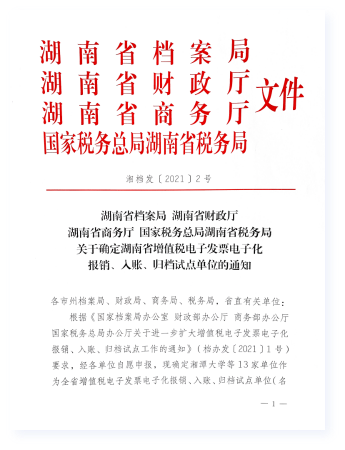 - 11月/2021验收通过2021年11月,湖南省档案局、财政厅、商务厅、国税总局湖南省税务局联合组织进行试点验收。湖南链聚信息科技基于自主研发的“四库档案管理系统”进行的试点方案和取得的试点结果,得到领导和专家的一致肯定,顺利通过试点验收。